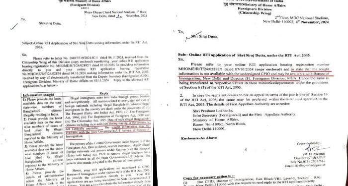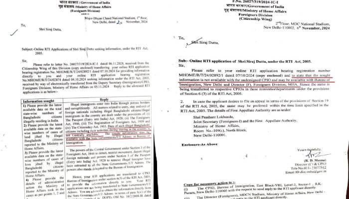 एक आरटीआई (सूचना का अधिकार) आवेदन के जवाब में यह खुलासा हुआ है कि गृह मंत्रालय ने कहा कि उनके पास बांग्लादेशी घुसपैठियों की संख्या या उनकी गतिविधियों के बारे में कोई जानकारी नहीं है. यह जानकारी तब सामने आई जब देशभर के राज्यवार बांग्लादेशी घुसपैठियों के विवरण के लिए सूचना मांगी गई थी.